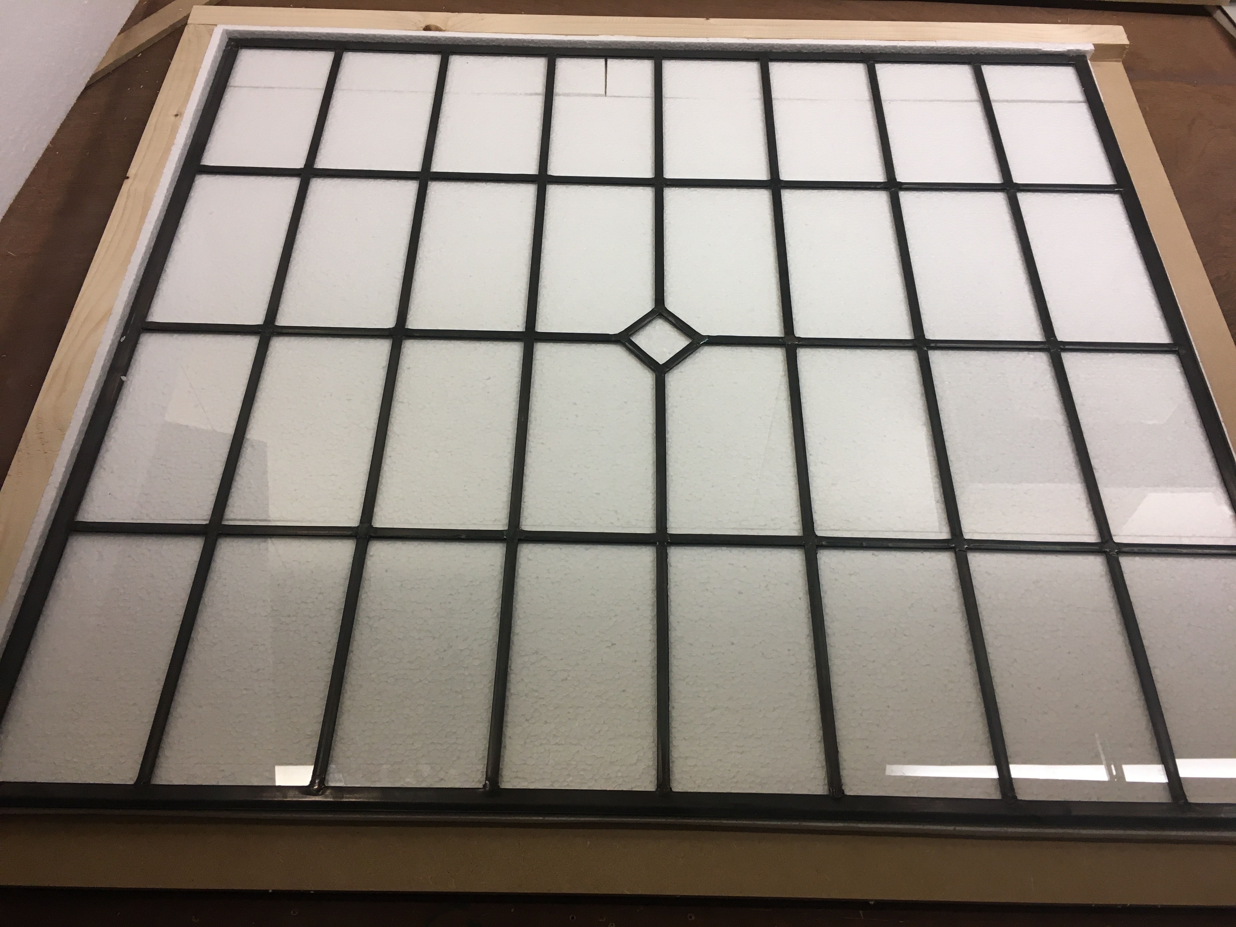 Bristol glas-in-lood raam – strak en tijdloos ontwerp met diamantdetail. Leverbaar in enkel glas (2 weken) of HR++ isolatieglas (4 weken).